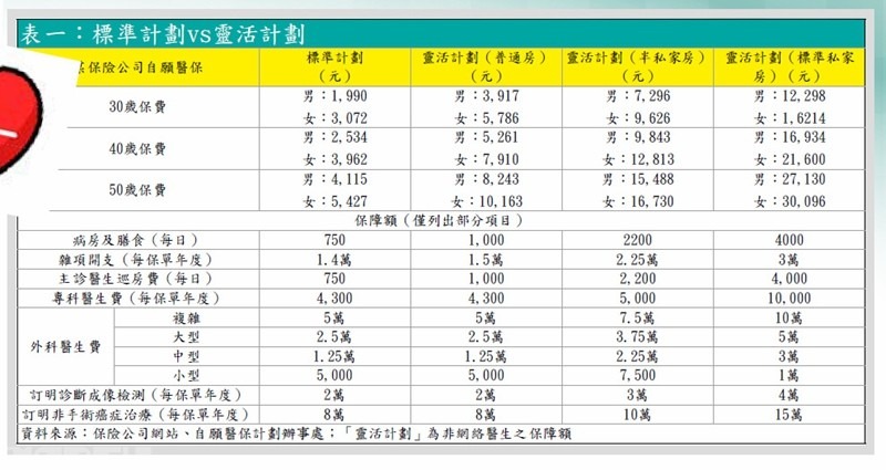 表一列出某保險公司的「標準計劃」及「靈活計劃」的保費與保障額。「靈活計劃」普通房(即私院大房)版本,保費貴標準計劃近一倍,而保障額基本上也差不多,如外科手術費、成像檢測的保障額均一樣,但「靈活計劃」設有額外醫療保障(SMM),可以額外賠償超出上述保障額的80%,要自掏腰包的醫療費較低。