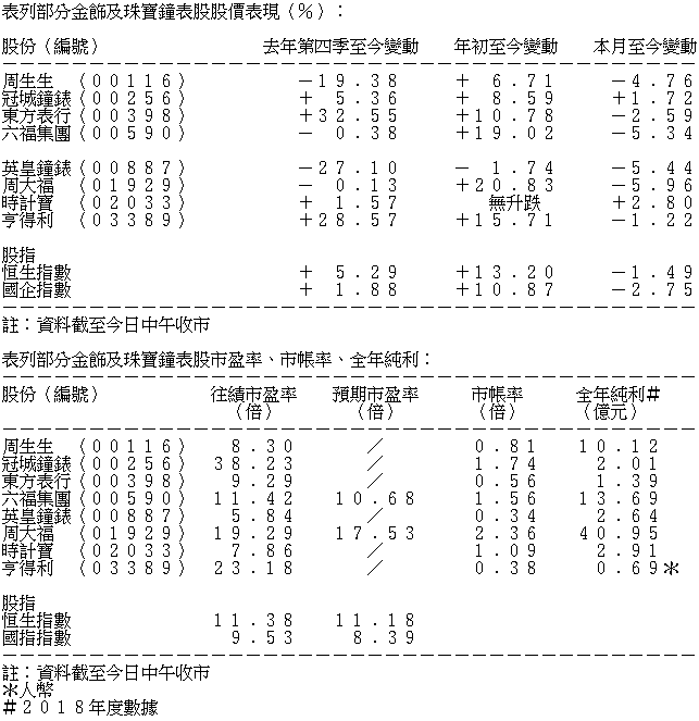 表列部分金飾及珠寶鐘表股股價表現