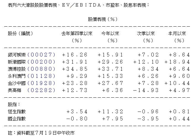 暑假作為濠賭股最重要的旺季之一,市場當然已經對未來數月的澳門賭收充滿憧憬。回顧過去半年澳門賭收的按年升幅和預期,今年2月農曆新年賭收增幅差過預期,但5月五一黃金周的賭收增幅又優於預期,另一方面,第二季貴賓博彩收入僅346.16億澳門元,較首季372.08億澳門元跌近7%,按年更跌15.6%,故的確令市場難以估計今年暑假旺季賭收會否向好。不過,據澳門6月博彩收入顯示,今年上半年澳門賭收達1495.04億澳門元,按年只微跌0.47%,或反映博彩收入放緩的情況沒有想像中嚴重。