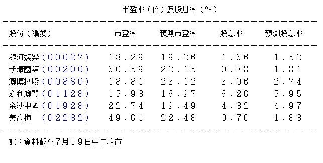 據匯豐證券研究周三(17日)發表的報告指,7月份首十四日澳門總博彩收入達115億澳門元,上周日均賭收約7.93億澳門元,假設本月剩餘日子的日均賭收介乎8.3億至8.8億澳門元,7月份賭收料介乎256億至265億澳門元,即按月錄得2%至5%增長,故預計暑假期間的賭收將帶來利好。