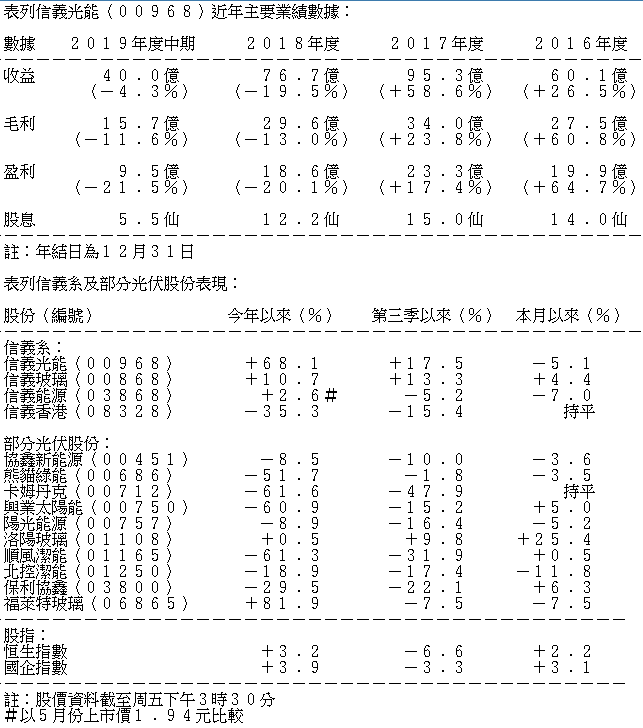太陽能玻璃銷售為信義光能最主要的業務,2019年上半年收入佔總收入的73%。信義光能2019年上半年的總收入下跌4.3%至39.97億元,就是因為太陽能玻璃平均售價下跌,以及人民幣及馬來西亞令吉兌港元貶值。期內,綜合毛利率較去年同期下跌3.2個百分點至39.3%,因為期內太陽能玻璃毛利率較去年同期下跌6.1個百分點至27.3%。太陽能玻璃毛利率下跌的原因包括期內有關玻璃平均售價下跌,國內天然氣價格和純碱和硅砂等原材料價格上漲,以致生產成本上升。其實,該公司今年上半年太陽能玻璃業務貢獻的溢利較2018年下半年已顯著提升,但仍然未能追及2018年上半年的水平。該公司半年純利較去年同期下跌21.5%至9.53億元。純利率由2018年上半年的29.1%減少至今年上半年的23.8%,主要由於太陽能玻璃業務的利潤率下跌、財務成本增加及自分拆後攤佔信義能源的溢利減少,而且期內產生上市開支。