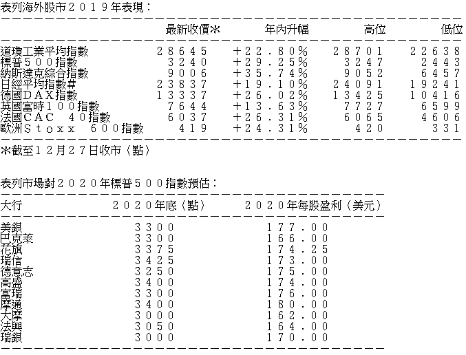 2019年美股屢創高位,最終三大股指,道指收28645點;標普收3240點;納指首破九千大關,報9006點。展望2020年,大行普遍認為美股將維持牛市,歐洲股市更可能跑贏美股。
