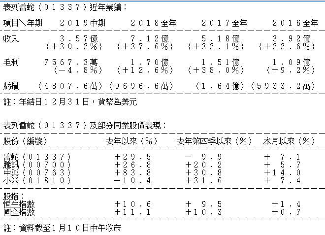 雷蛇於2017年11月上市,由上市新高5.49元一路尋底,2018年12月見歷史低位1.01元,目前現價約1.29元,近年來約在1.6元左右阻力明顯。投資者如有興趣,現價追入亦未嘗不可,只要不穿1元關口仍可持有,股價催化劑是公司能否奪得新加坡的金融牌照,雷蛇手機三代研發時間表,以及3月份公布的全年業績有爆發性增長。假如現價追入,能夠升破1.6元關口,投資者可考慮加注;但如未能突破1.6元關口,則可考慮先行食胡。
