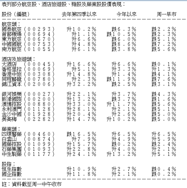 武漢市衛健委凌晨通報,新增一宗新型冠狀病毒感染的肺炎死亡病例,在過去兩天共新增136宗確診個案。另外,在北京和深圳分別首次確診新型冠狀病毒感染肺炎的病例。武漢肺炎似有向外擴散的跡象,加上春節臨近,市場憂慮疫情或加劇,航空股、濠賭股及酒店旅行相關股重挫,惟醫藥股逆市跑出。