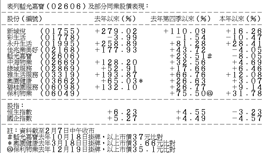 物管板塊從去年至今仍屬熱炒板塊,但普遍於去年12月見整固,但大部分物管股已於今年始重新發力兼繼續創歷史新高。然而,藍光嘉寶於去年10月18日掛牌,上市價為37元,股價於11月21日創出56.4元的歷史新高後股價便見調整,加上近期中國內地出現新型冠狀病毒疫情,令其股價進一步受挫,本年暫最低曾見41.8元。