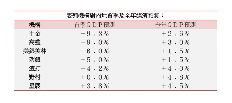 表列機構對內地首季及全年經濟預測