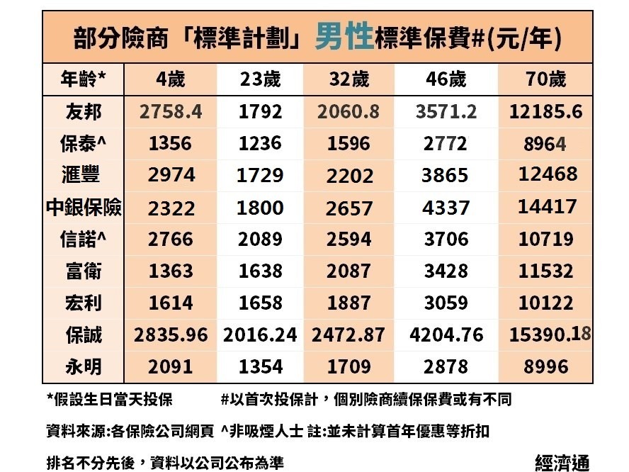 政府規定保險公司必須公布保費表,消費者格價從此更加方便。為了讓讀者了解不同人生階段的保費,本欄特別選了4、23、32、46及70歲的非吸煙人士,作為格價參考(見表)。