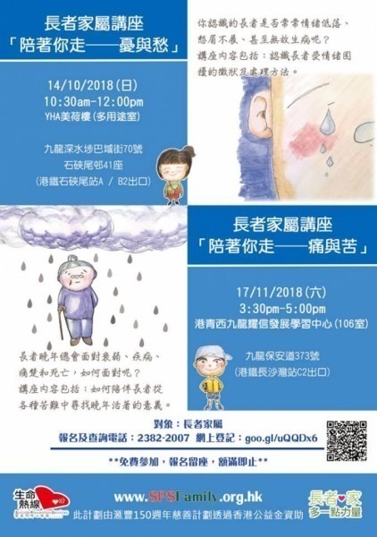 生命熱線「長者‧家‧多一點力量」計劃將舉辦兩個免費講座,認識長者心理、受情緒困擾的徵狀和處理手法。「陪著你走 - 憂與愁」:你認識的長者是否常常情緒低落、愁眉不展、甚至無故生病呢?此講座將帶領家屬認識長者受情緒困擾的徵狀及處理方法;「陪著你走 – 痛與苦」:長者晚年總會面對衰弱、疾病、痛楚和死亡。此講座將引領家屬如何陪伴長者從各種苦難中尋找晚年活著的意義。